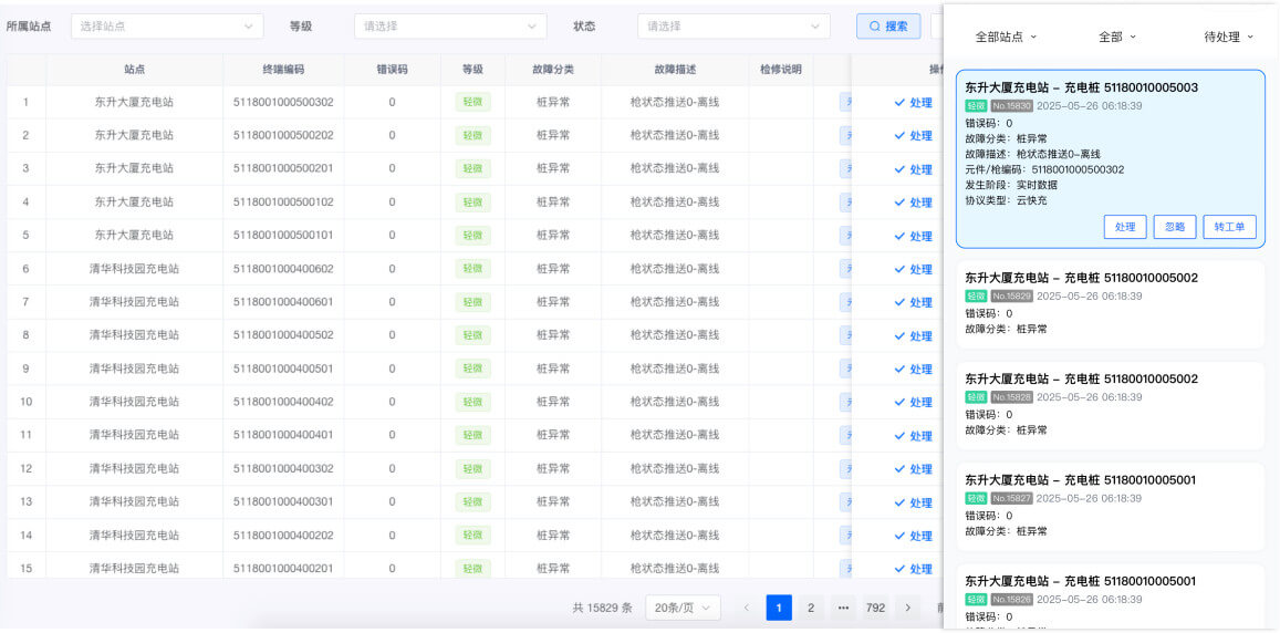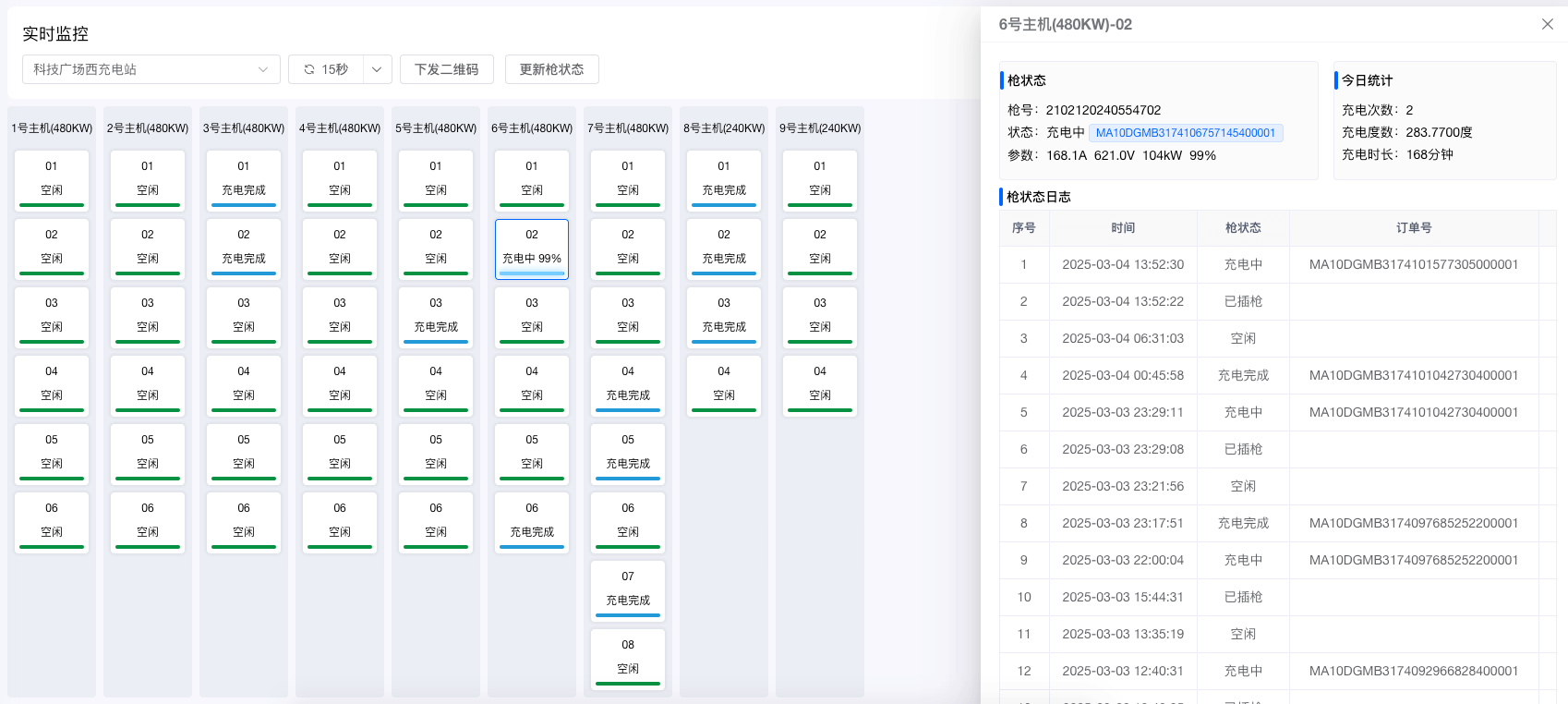 站点维度下,展示充电桩不同状态和当日充电数据、实时充电进度/电压/电流/功率/订单详情,故障清单、处理状态和故障趋势。可远程应急操作,如全量更新充电桩状态、强制结束订单等。可设置预警机制,进行站级实时异常告警。