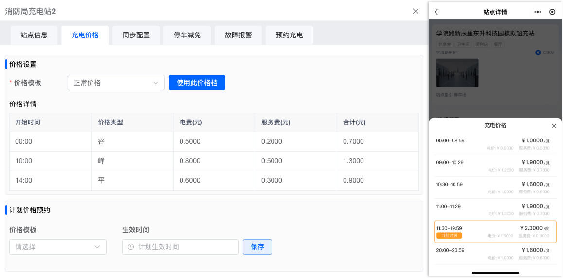 平台可设置价格模版,并实时/定时下发至指定站点。可配置价格预约生效规则,在指定时间点下发新价格。