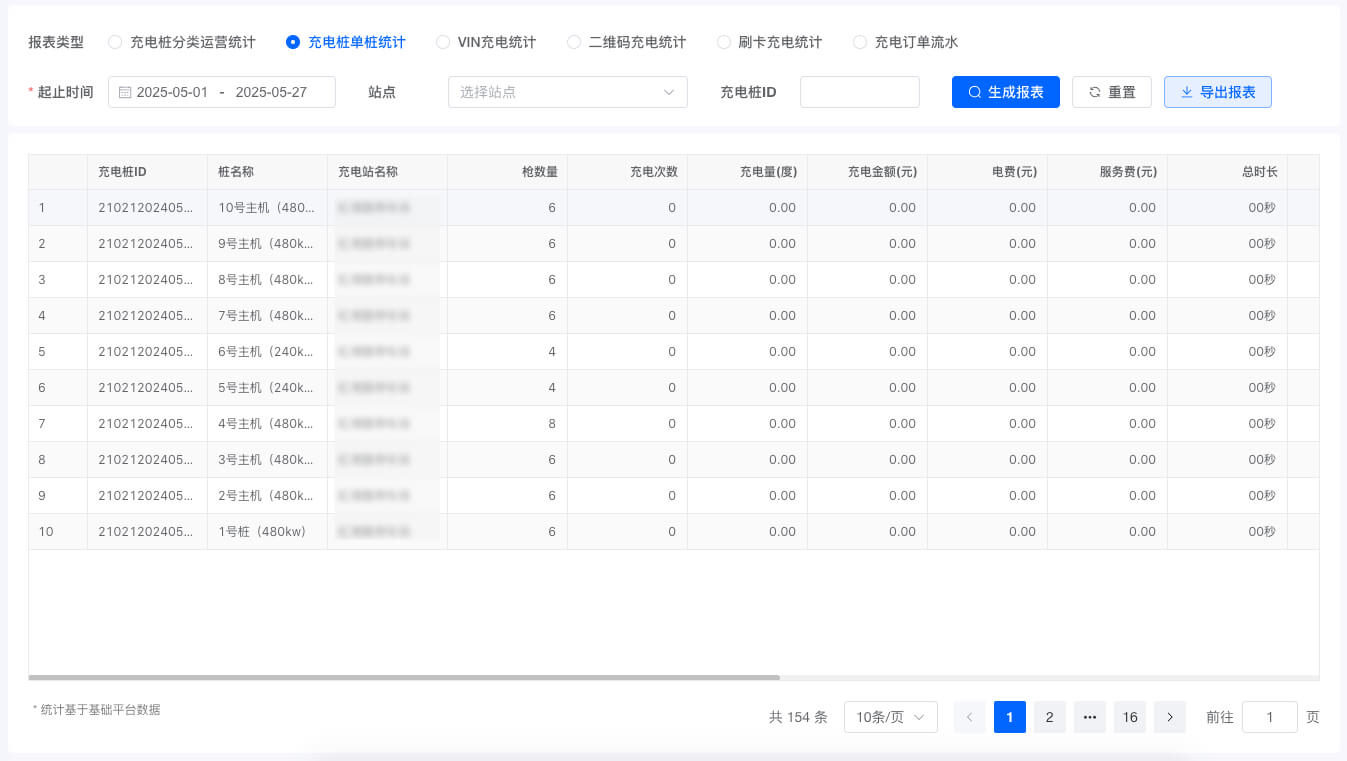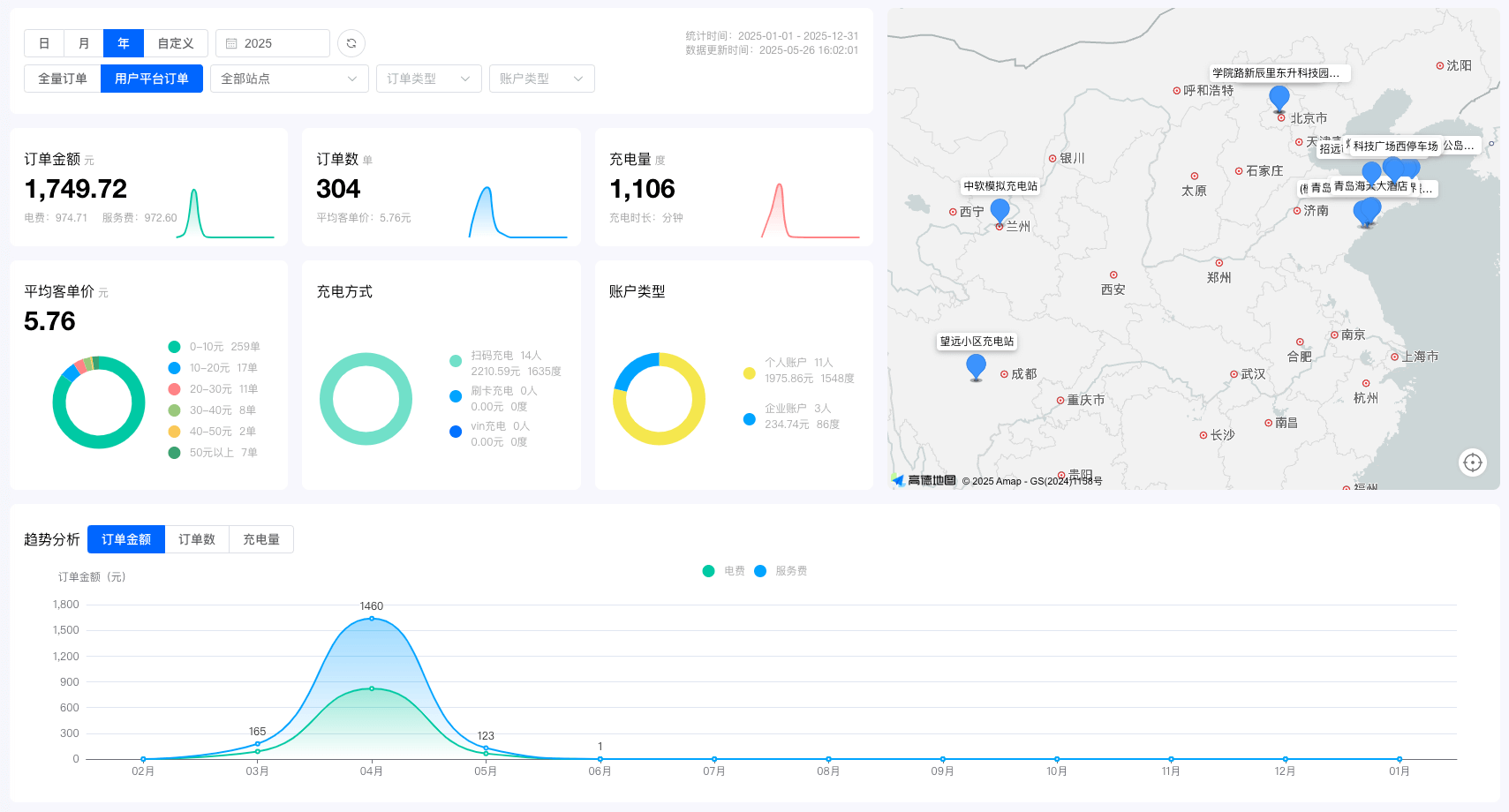 从运营视角,对平台整体或单站数据进行有效监控,可定制查询当日、月、年或指定范围的充电量、服务次数、收入、客单价分布、客户运营商分布及相关趋势。